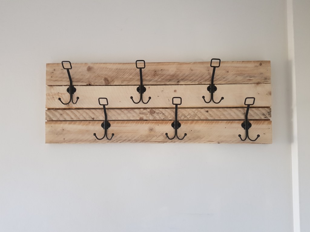 Once at home I only needed a few hours to sand it down nicely with first 80grit paper and later on smooth it with 120 and 180 grit. I ordered the hooks online along with some wall fixings and when everything arrived it only took me an hour to assemble it and fix it on the wall. We use it ever since with no problems.