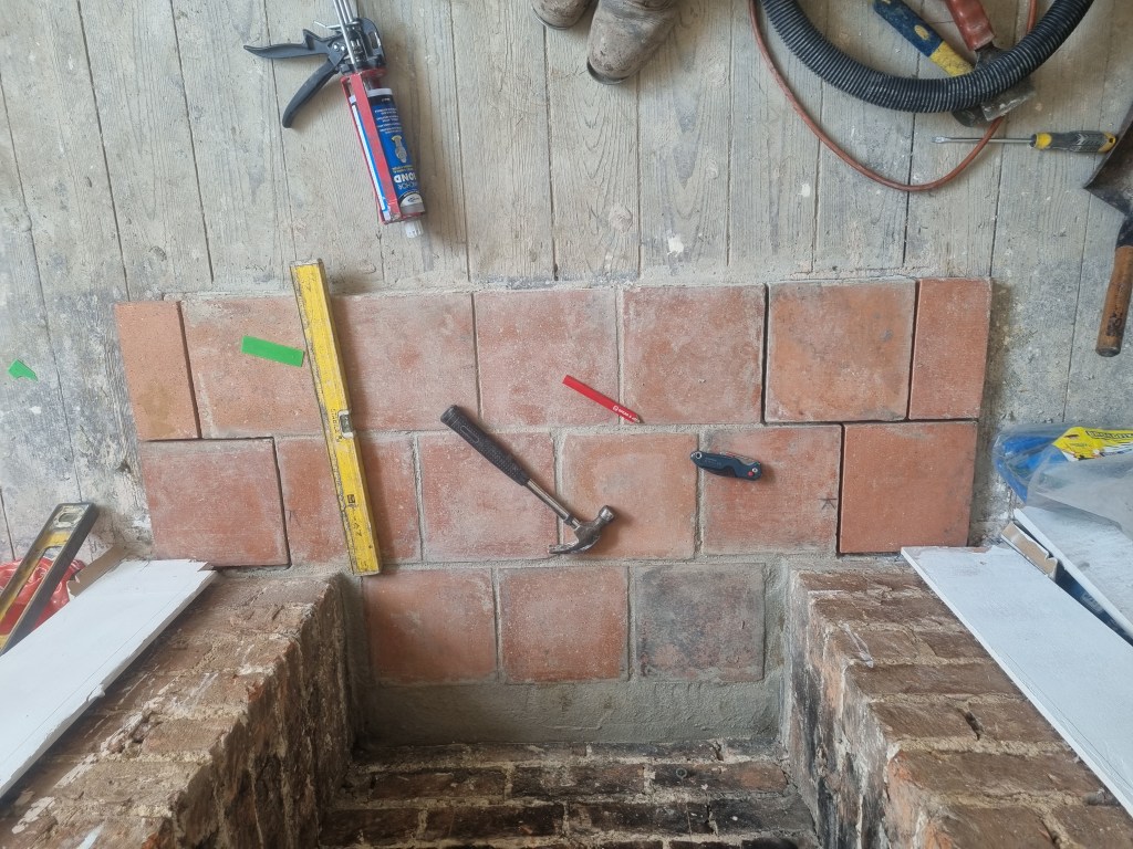 The hearth was made out of quarry tiles but it wasn’t quite wide enough for the new fire surround, so I had to remove a few tiles from the edge and extend the width of the hearth. Once I took away the tiles, I had the clear and prepare the surface for the new layer of adhesive. I set out the tiles and I realised that I have cut and chamfer some of them (these are all handmade quarry tiles) to match up nicely.