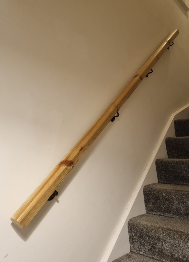 I was wondering in a timberyard and I found these nearly round lengths of timber and asked about them. They were wood rolls/king rolls and lead workers are using them when they join two sheets of lead on a flat or angled roof. The best thing is that you can buy them for less than £25! I also ordered a sets of handrail fixing for about £10 and tadaaa, we had a handrail. It took me a good 2-3 hours of sanding/clear varnishing and probably another 30 minutes to fit it, but it was still the cheapest way of getting a handrail done.