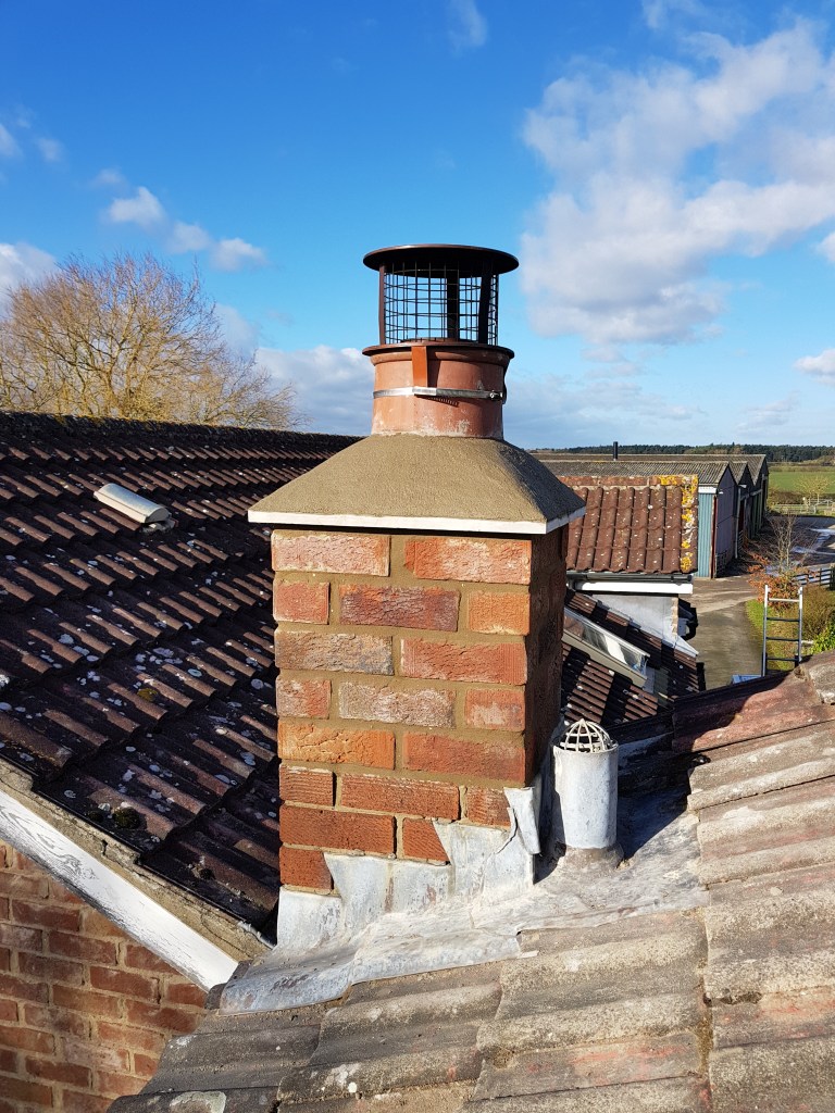 This was a quick day job just outside of York on a farmhouse. The cement bed (flauching) was blown on top of the chimney stack and the top few courses of bricks of have seen better days as well.