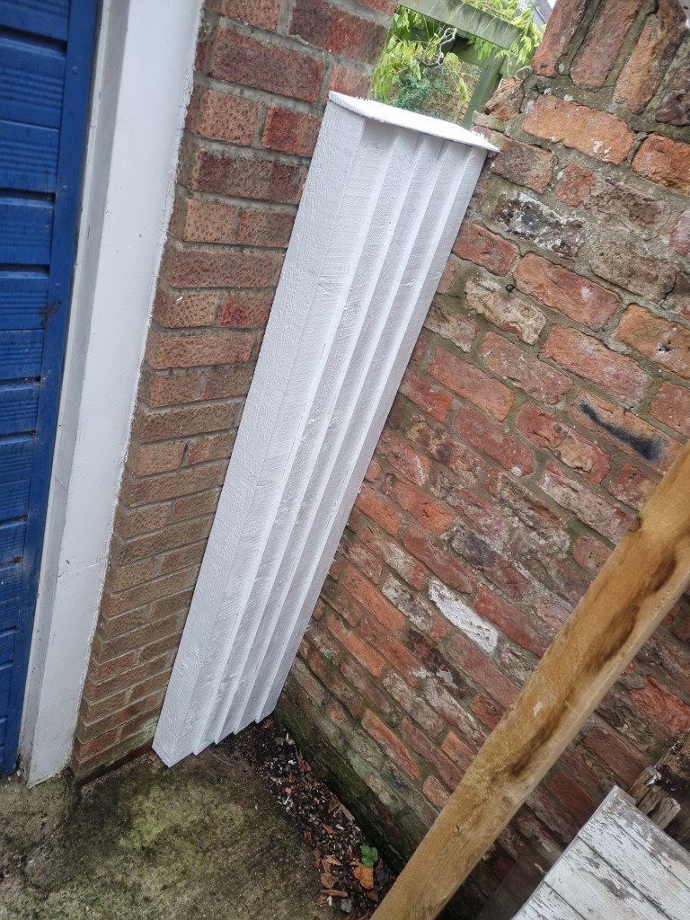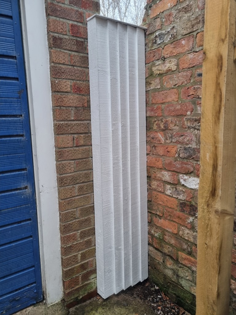 Once this was done I got some feather edge boards and set out the boards to make sure they have decent overlap and that these overlaps are even all the way. I used galvanised nails to fix them onto the frame. I even made a small cap out of a board to protect the end of the featherboards from the elements. As a last step I painted the whole lot white, as per the clients request.