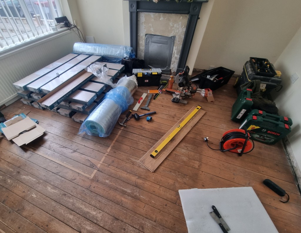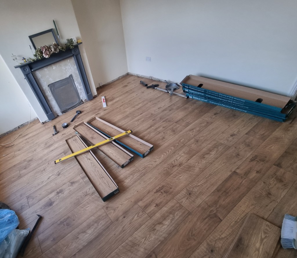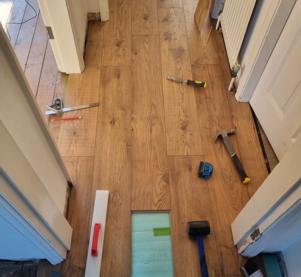 So I spent a large chunk of my first morning with bits of laminate floor and my tape measure to make sure the pattern is square where it has to be square, and running along with the corridor and the main walls.