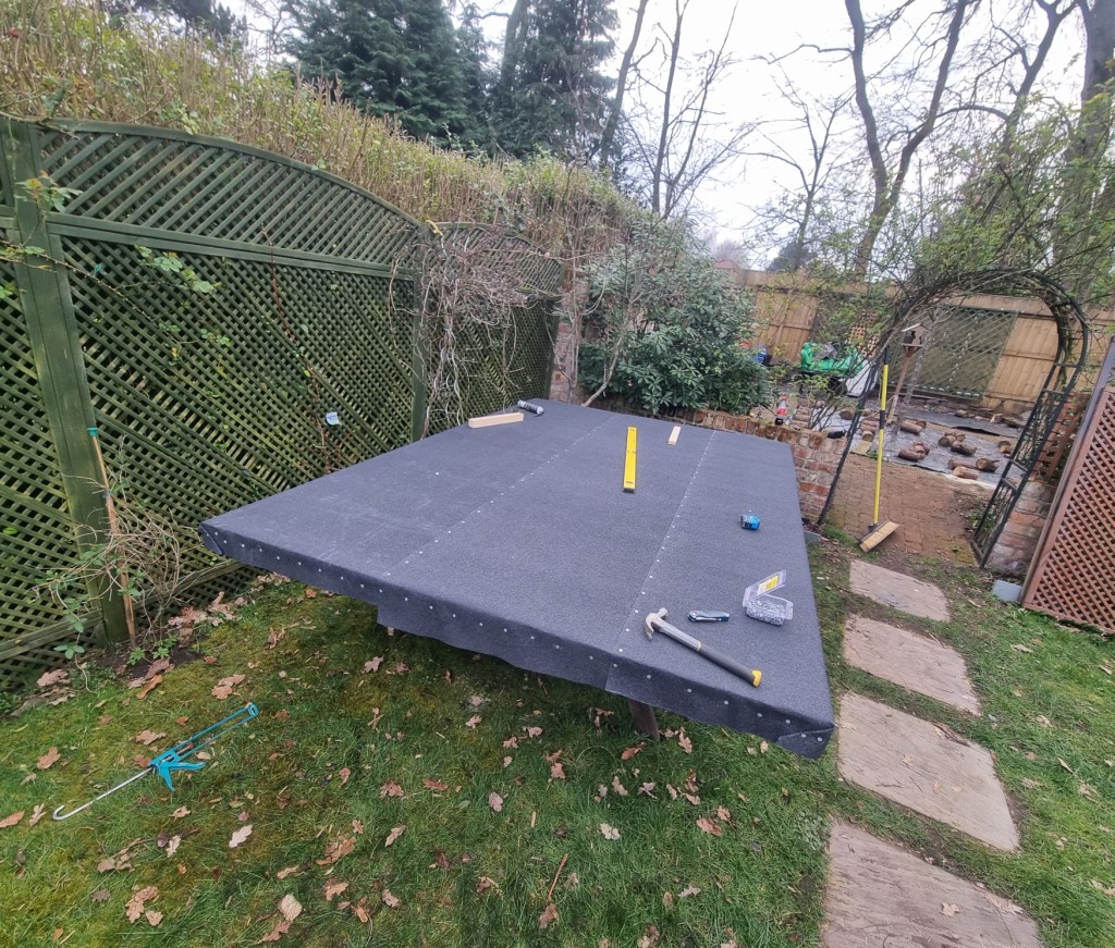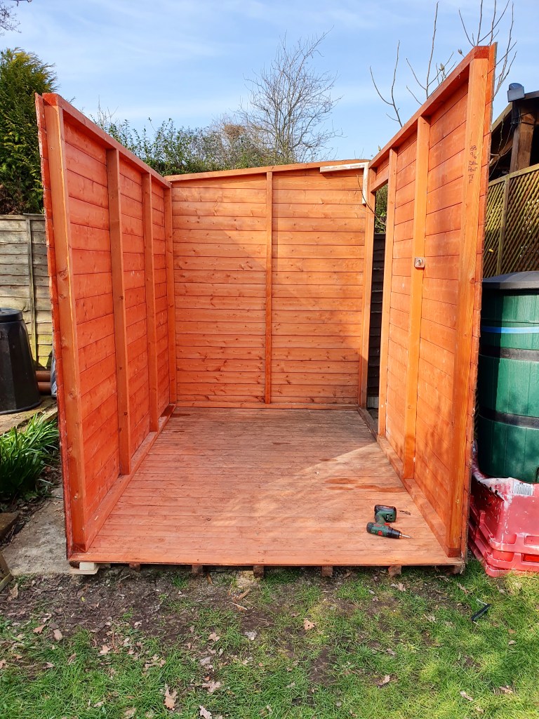 Large project and it took us nearly two days to complete it. First we started to take the shed apart. Roof came off relatively easy but the walls were fixed together really strong with large bolts. Luckily only one bolt snapped, all the others came out nicely after a bit of convincing. Once all the walls were off, we could have a good look on the base. We found a bit of rot underneath, so that needed a touch as well. When I finished with all the floor repair and reinforcement, it was time to place the floor on its concrete base. Obviously, the concrete was not level, so I spent another 40 minutes propping up various parts to keep the floor panel as level as possible.