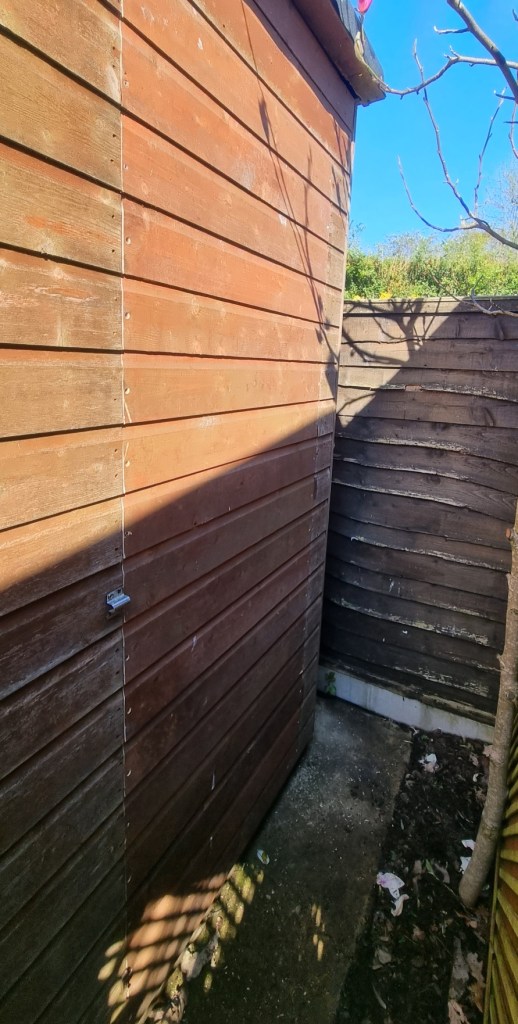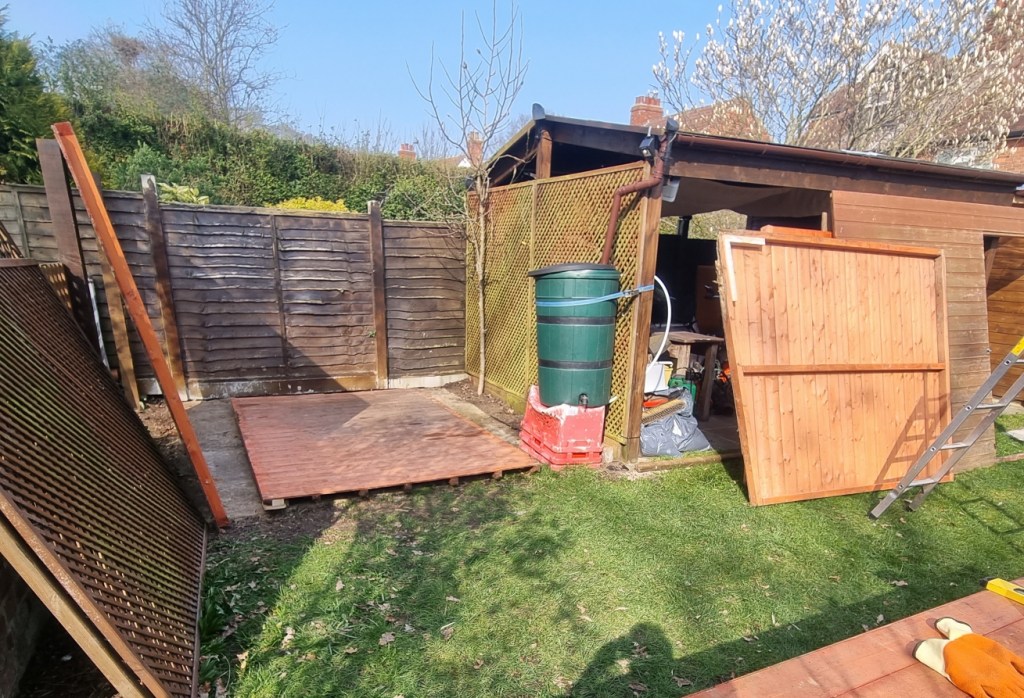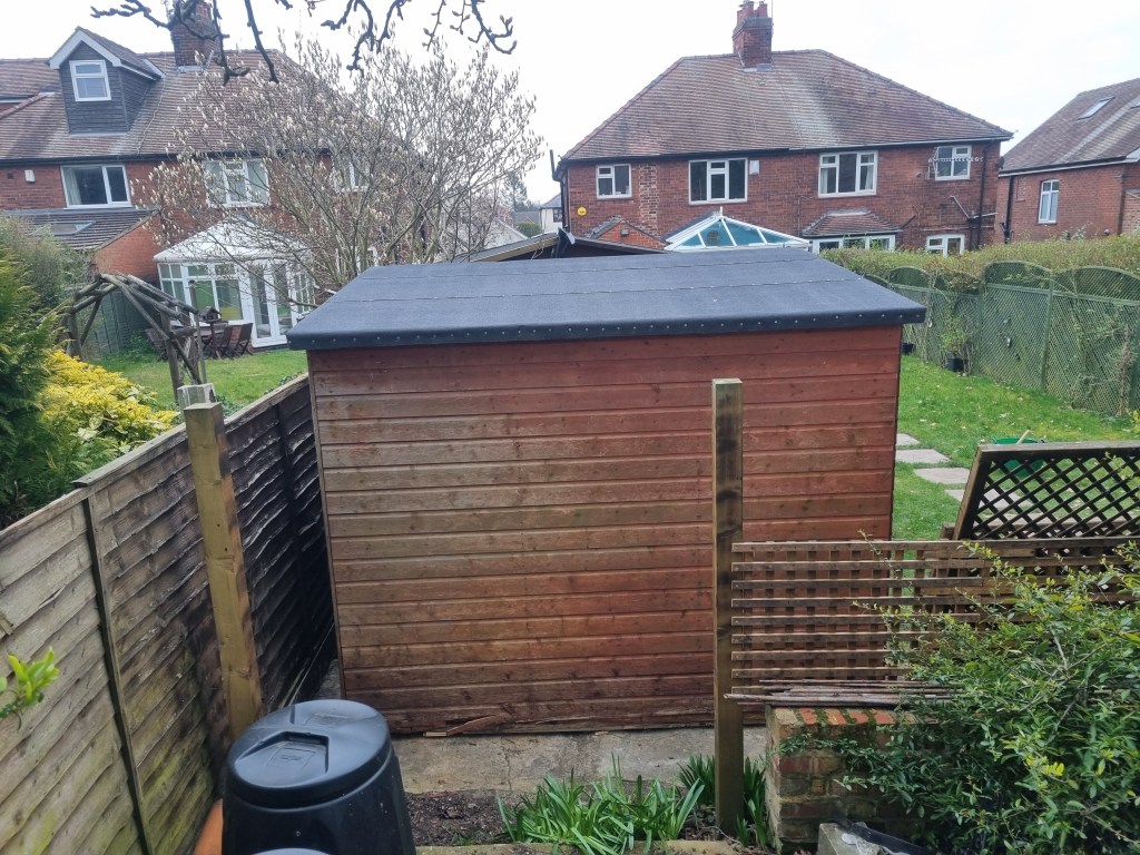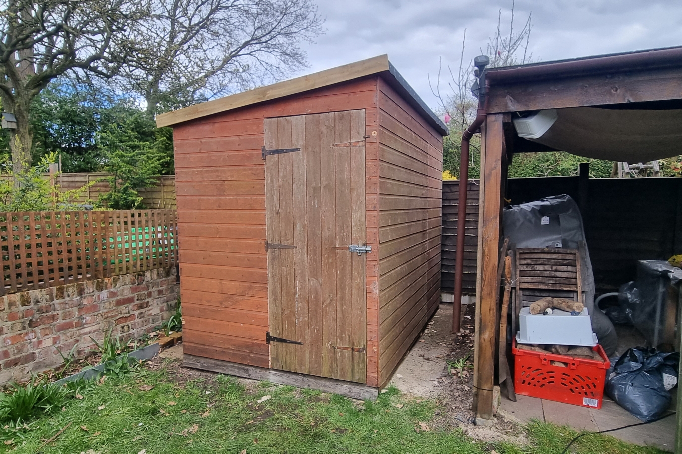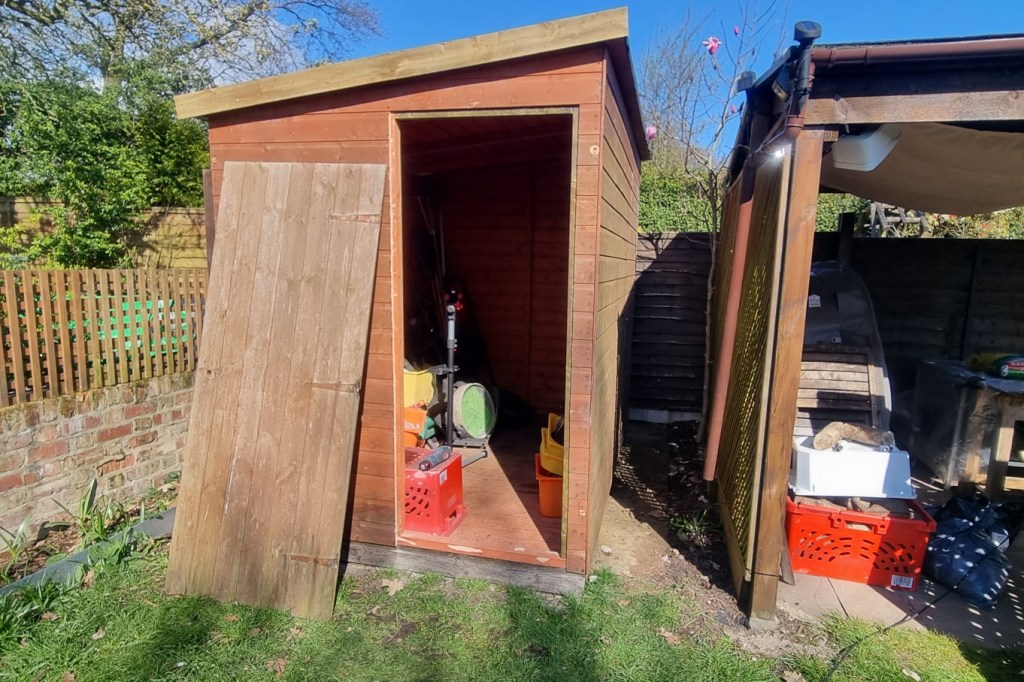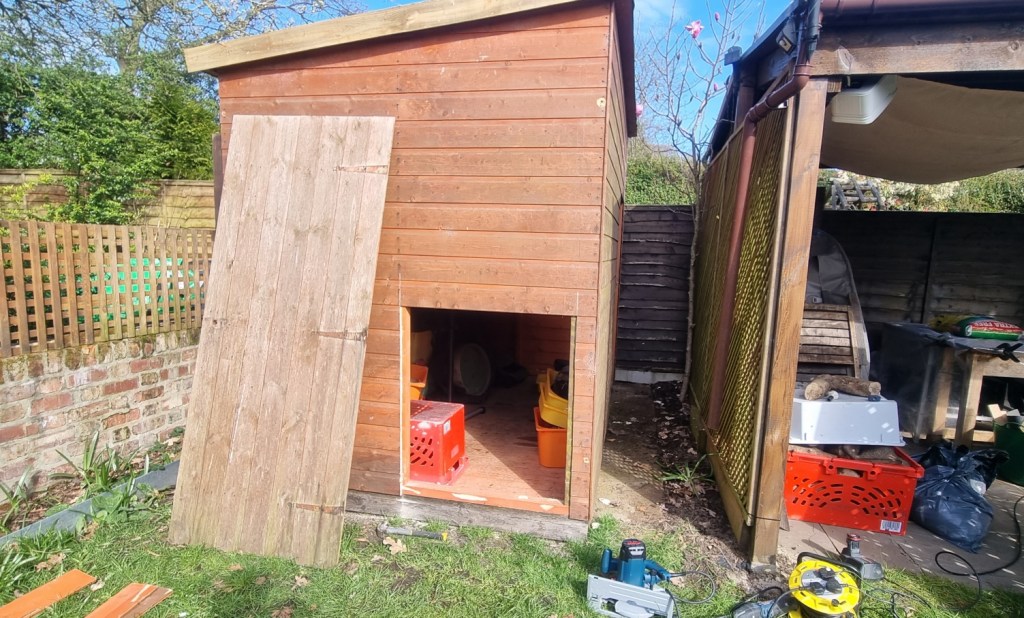 This was a rather different work from the normal repair it/fix it type jobs. When the customer bought his house there was a large and very sturdy looking shed at the back of his garden. The roof felt was long gone and there was a rotten corner in the roof panel but otherwise, it was in a very good condition. The only problem was that the customer didn’t like where the shed is in his garden. He planned to keep his gardening tools in it and it’s just not convenient to walk down to the very end of the garden every single time to get the secateurs (we are talking about a really long garden). So the project had 3 goals. 1: to move the shed closer to the house. 2: repair rotten roof corner and re-felt roof. 3: to change the door on the shed. After moving the shed it ended up in a different angle and the door was on the wrong side. So the last task was to build a new doorframe inside, cut out the wall for new door and patch up the old door opening.