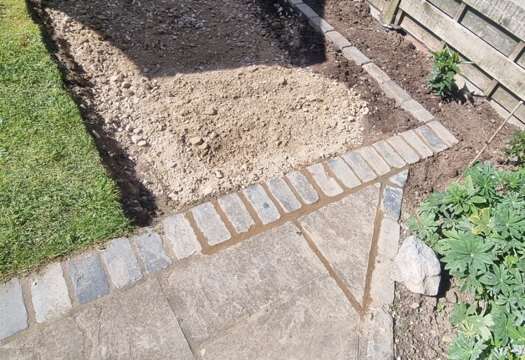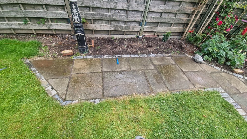 I started my work by removing the edging stones and the flags from the patio, carefully, as I had to re-use the edging on a later stage. Once this was all done I broke up and removed the mortar base and went down until the hardcore layer. The customer wants to lay some frush turf here later on so we needed enough depth for some soil and the turf too.
