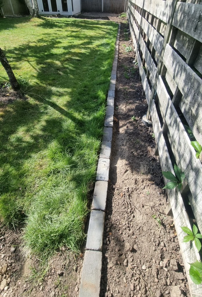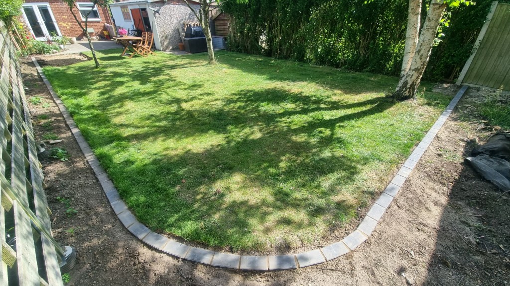 Once it was all conpleted I moved on to the grass border. The customer wanted it nice and simple, so I used driveway blocks and bedded them into sand. To start, I measured up the whole lot and marked it out with a string. After this I prepped the ground with a spade and shovel to make sure the grass had a nice straight edge. I also had to mark out a curved corner.