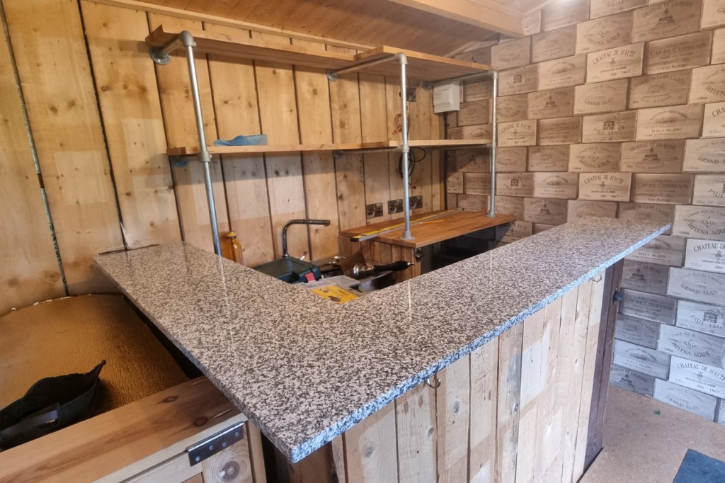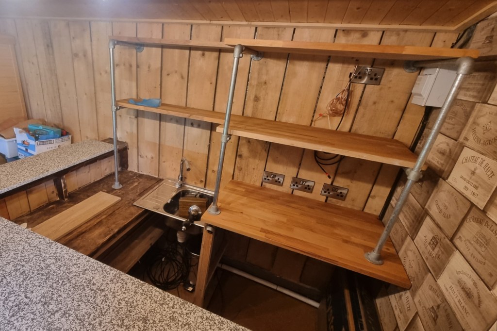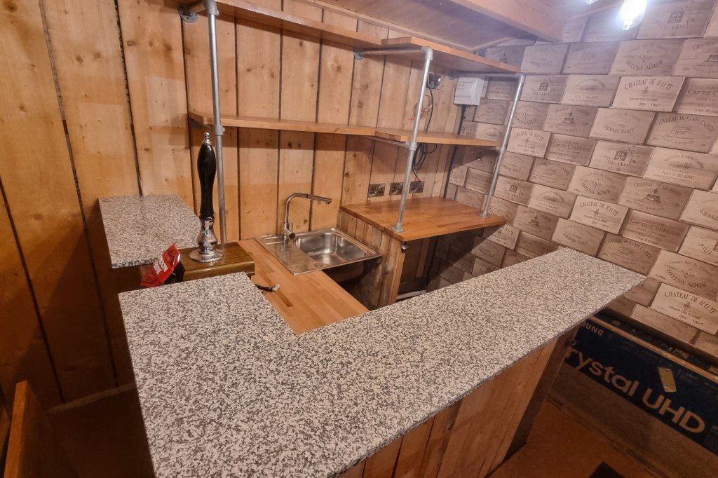 I really enjoyed doing this project even though it was challenging at times. I had 3 days of work in this so far, and I would say it’s about 90% finished. This whole project started when the owner bought this house which came with a few sheds. In one of these, the previous owner made a bar counter and shelving out of scaffolding boards. Which for the time looked ok, but the current owner wanted to make this look a bit more professional. So the plan was that all the painted scaffolding board surfaces and shelves are coming out and we replace them with solid wooden kitchen worktops. The bar counter will have a marble top, we make sure the sink is working properly and we set up a beer pump as well.