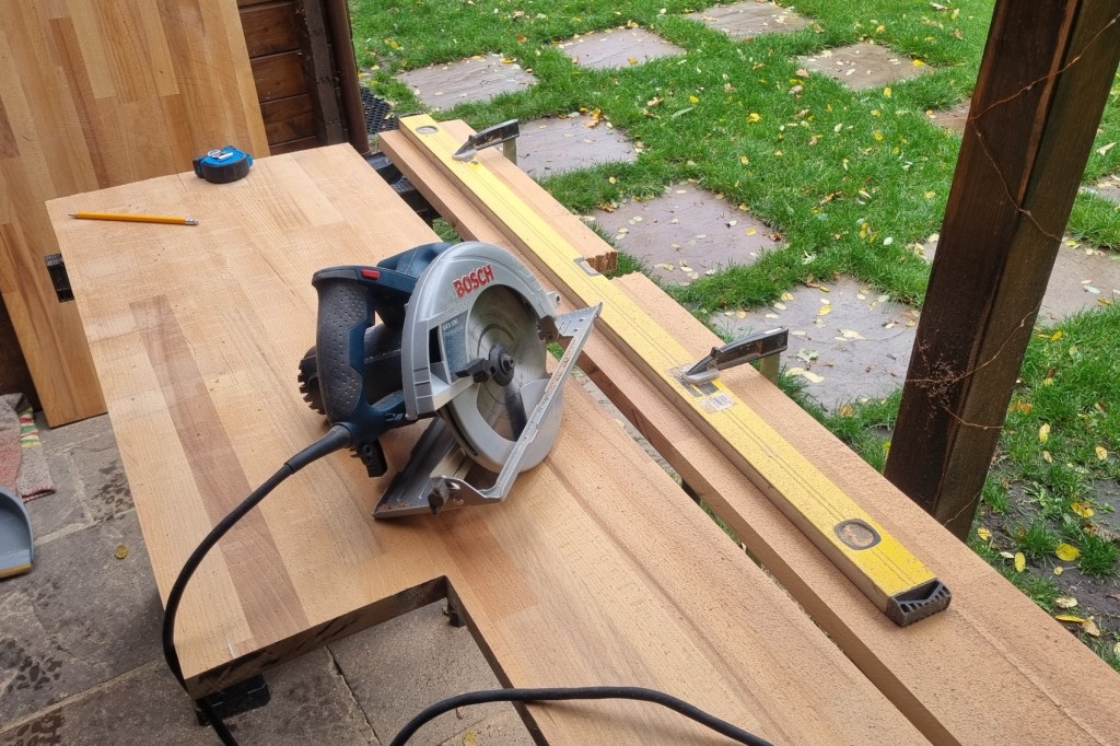 A couple of foldable saw horses, squares and long spirit levels, hand saw, jigsaw and my trusty circular saw. I used a pair of F clamps and a spirit level to act as a guide for my circular saw as I had to make a few long (nearly 2 meters long) cuts as well. Once the first shelf was cut, I tried how it would sit on its frame. I won’t lie it was hard graft to move these long and wide (over 2 metres by 50 cm) shelves around. I definitely felt my arms and shoulders at the end of the day. When I finished cutting both shelves, I started sanding. The old wooden surface needed some sanding to bring it back to its former glory, but once it was finished, it definitely looked good on the shelving racks.