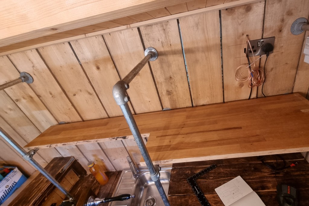 After all this, I started to measure up for the new worktop. It was a painstakingly long process for many reasons. I had to make a new worktop exactly the same size as the old one. The old one of course was far from being square, there were cuts all around the edges to allow for the frame of the bar. and I had to cut out a large chunk for the sink as well. So after it felt like an eternity I had to new worktop marked and cut. It was time to level it and fit it to the frame. At this point I felt that it all starts to come together. We already had the bar countertop and the worktop right below fitted and I could start to re-assemble the shelf brackets and the shelves.